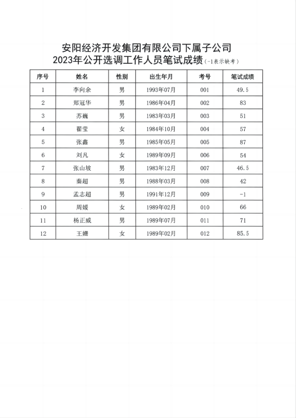 安陽經(jīng)濟(jì)開發(fā)集團(tuán)有限公司下屬子公司2023年公開選調(diào)工作人員筆試成績公示